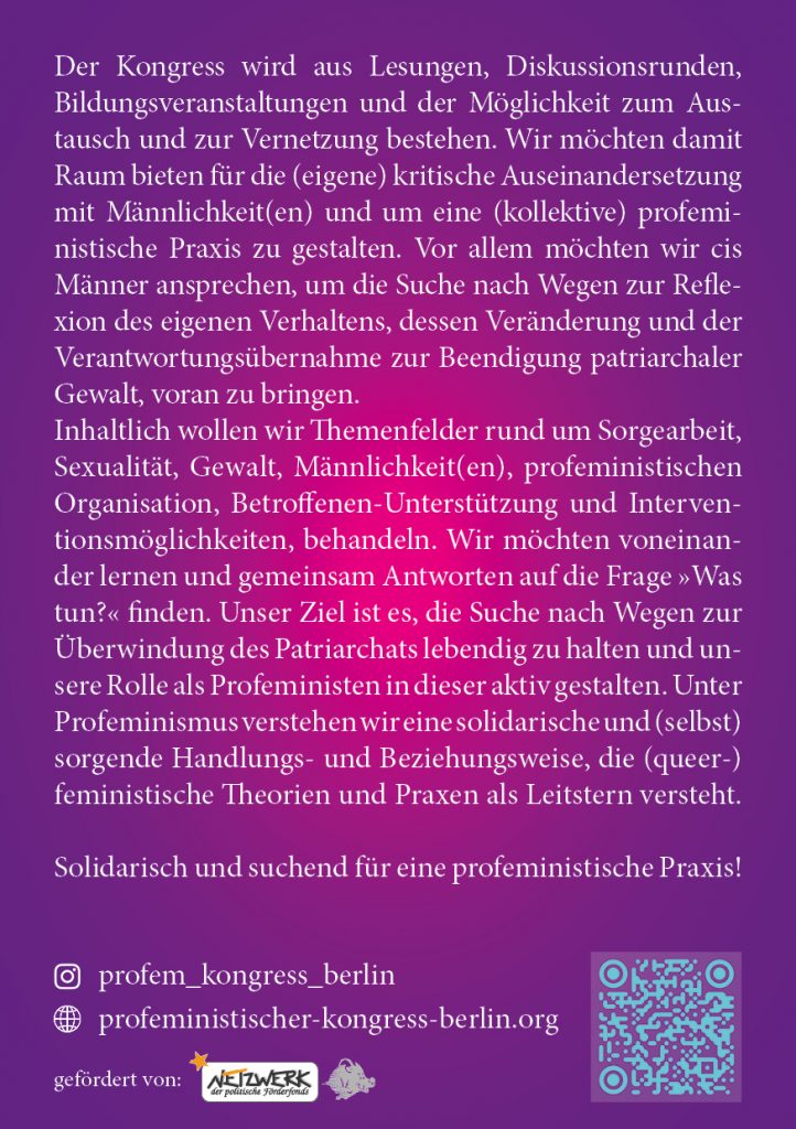 Hier findet Ihr sämtliche Materialien rund um den Kongress. Wenn Ihr Flyer oder Plakate benötigt, da Ihr Sie in Eurer Stadt auslegen/plakatieren möchtet, könnt Ihr uns gerne anschreiben und wir schicken Euch welche zu oder Ihr ladet Euch die Druck-PDF runter und gebt selber welche in Druck.